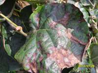 發(fā)病部位多從葉緣開始,初期在葉緣出現(xiàn)水漬狀污綠色小點,后期病斑沿著葉緣或向內(nèi)發(fā)展,形成不規(guī)則的病斑,并且病斑逐漸變?yōu)榛野咨,病斑邊緣呈綠色。如果感染果面,則出現(xiàn)淡褐色小點,最后呈不規(guī)則褐斑,果皮干腐,果肉腐爛。