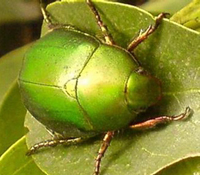 屬于鞘翅目(特點前翅堅硬,后翅膜質(zhì)),是咀嚼式口器,所以說被害植物有缺口、孔洞燈機械損傷,嚴(yán)重時可以吃光葉片,咬斷根莖。常在傍晚至晚上10時咬食最盛。常見的有銅綠金龜子、朝鮮黑金龜子、茶色金龜子、暗黑金龜子等。多在夜間活動,有趨光性。