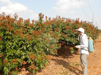 對于花帶葉和沖梢的類型,進行脫小葉處理。在荔枝妃子笑品種上進行化學藥劑脫小葉處理:國光乙烯利3-5ml/15kg,配合磷鉀營養(yǎng)。白糖罌等品種上不進行化學藥劑脫小葉處理,一般進行人工摘葉處理。