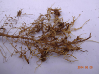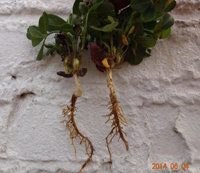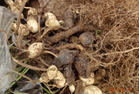 癥狀:花生根結線蟲病主要為害植株的地下部,因地下部受害引起地上部生長發(fā)育不良。幼苗被害,一般出土半個月后即可表現(xiàn)癥狀,植株萎縮不長,下部葉變黃,始花期后,整株莖葉逐漸變黃,葉片小,底葉葉緣焦灼,提早脫落,開花遲,病株矮小,似缺肥水狀,田間常成片成窩發(fā)生。雨水多時,病情可減輕。