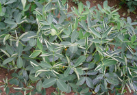 癥狀:(1)葉片:通常先從葉尖開始發(fā)病,少數(shù)從葉緣發(fā)病,病斑呈楔形或半圓形,由初期褪綠漸變黃、變褐,邊緣深褐色,周圍有黃色暈圈,后變灰褐、枯死破裂,狀如焦灼,上生許多小黑點即病菌子囊殼。葉片中部病斑初與黑斑病、褐斑病相似,后擴大成近圓形褐斑。該病常與黑斑病、褐斑病混生,有明顯胡麻斑狀。在焦斑病病斑內(nèi)有黑斑病或褐斑病或褐斑病、銹病斑點。收獲前多雨情況下,該病出現(xiàn)急性癥狀。葉片上產(chǎn)生圓形或不定形黑褐色小漬狀大斑塊,迅速蔓延造成全葉枯死,變黑褐色,并發(fā)展到葉柄、莖、果針上。(2)莖及葉柄:病斑呈不規(guī)則形,淺褐色,水漬狀,上生小黑點。