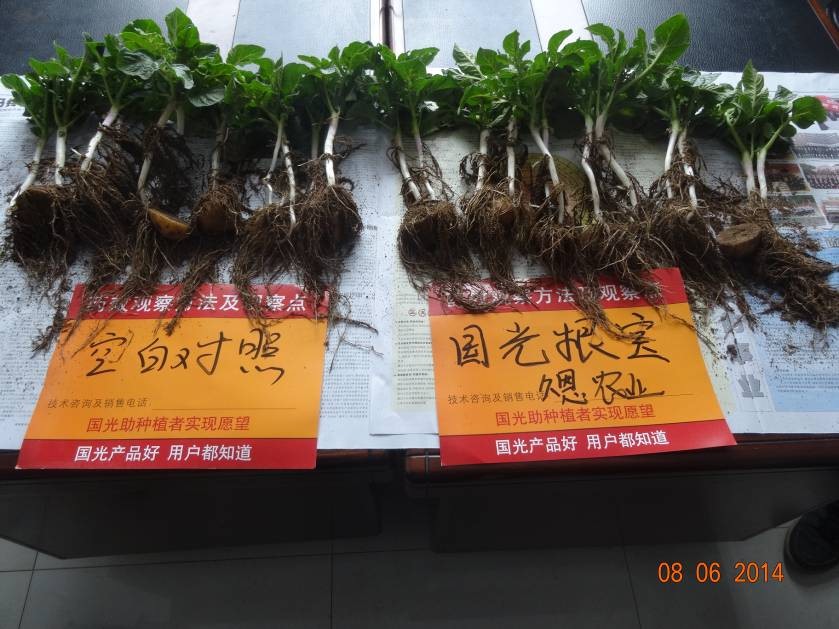 2014424日在河北張家口市沽源縣黃蓋淖(久恩農(nóng)業(yè)開(kāi)發(fā)有限公司)與公司技術(shù)總監(jiān)陳軍在馬鈴薯(荷蘭十五)上使用國(guó)光根寶75ml/畝溝施,201468日進(jìn)行觀察并從溝施根寶地塊和對(duì)照地塊分別隨機(jī)選取6個(gè)長(zhǎng)勢(shì)一致的植株,選取的每個(gè)植株均有6片葉,2個(gè)芽,測(cè)量根數(shù)量及根層數(shù)。
