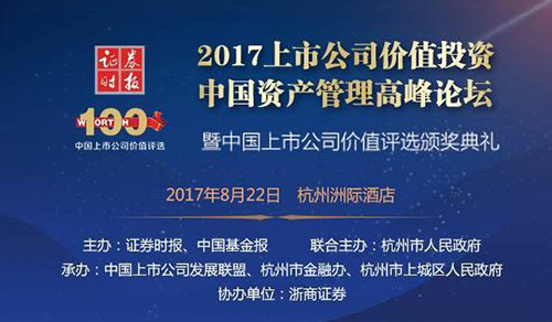 2017年8月22日,由證券時(shí)報(bào)社、中國基金報(bào)社主辦,杭州市人民政府聯(lián)合主辦,中國上市公司發(fā)展聯(lián)盟、杭州市金融辦、杭州市上城區(qū)人民政府承辦的“2017上市公司價(jià)值投資·中國資產(chǎn)管理高峰論壇暨中國上市公司價(jià)值評(píng)選頒獎(jiǎng)典禮”在杭州市洲際酒店舉行。