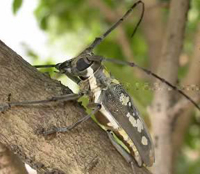 發(fā)生規(guī)律:脊胸天牛屬鞘翅目天?疲饕杂紫x蛀食樹干、主枝,影響水分和養(yǎng)分的輸導(dǎo)。每年發(fā)生1代,跨年完成。幼蟲在蛀道內(nèi)越冬,大部分在2~4月化蛹,4~5月大量成蟲出現(xiàn)。成蟲羽化、交尾、產(chǎn)卵等活動(dòng)均在夜間進(jìn)行,白天多棲息在葉片濃密的枝條上。交尾后的雌蟲大多數(shù)產(chǎn)卵在枝條末端的芽痕或枝條傷口的皮層與木質(zhì)部之間的縫隙中。成蟲壽命14~35天,卵期10~12天。幼蟲孵化后即蛀入枝條向主干方向鉆蛀,在孔道內(nèi)開一個(gè)通氣和排泄的孔洞,洞口外常黏附有樹液、木屑、蟲糞等黑褐色的混合物,這是天牛危害的重要標(biāo)志。幼蟲期長達(dá)265~311天,老熟幼蟲在蛀道內(nèi)化蛹,蛹期30~50天。