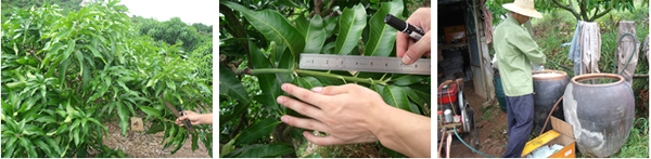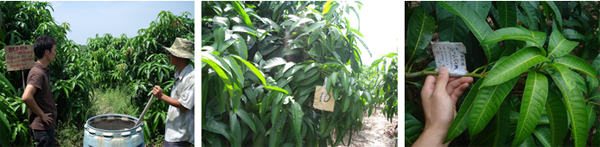 海南三亞英州鎮(zhèn)種植戶蔡桂香,在2010年5月20日,使用15%國光多效唑可濕性粉劑、25%國光甲哌鎓水劑對臺農(nóng)芒進行葉面控梢處理。后期表現(xiàn)效果:葉片濃綠加厚,枝梢及時停止生長,不“沖梢”;枝梢生長短壯。圖為蔡貴香果園。