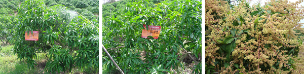 海南三亞英州鎮(zhèn)種植戶蔡桂香,在2010年5月20日,使用國光烯效唑、國光萘乙酸(5%水劑)對臺農(nóng)芒進行葉面控梢處理。后期表現(xiàn)效果:不“沖梢”,催花容易,出花整齊。圖為蔡貴香果園。
