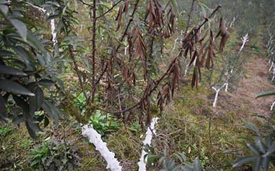 (2)發(fā)現(xiàn)危害嚴(yán)重,枝干破損嚴(yán)重的樹,需及時(shí)清理并集中燒毀或深埋。
