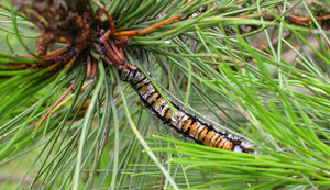 為害特點(diǎn) 以幼蟲群集取食松樹針葉,輕者常將松針食光,呈火燒狀,重者致使松樹生長極度衰弱,容易招引松墨天牛、松縱坑切梢小蠹、松白星象等蛀干害蟲的入侵,造成松樹大面積死亡。